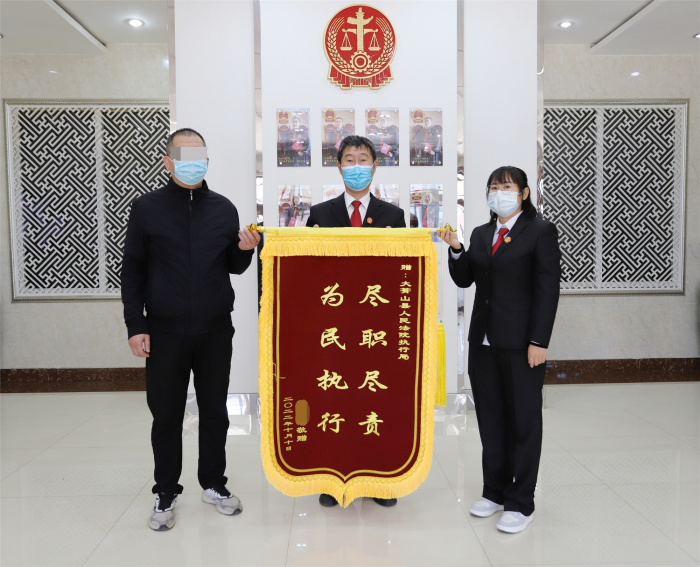 10月18日上午,申请执行人徐某来到大箐山县人民法院,将一面印有“为民执行尽职尽责”的锦旗送至执行法官手中,表达对法院尽心尽责执行,自身权益终获实现的感激之情。“没有执行工作人员的雷霆出击,我不可能这么快的挽回损失,真是太感谢了!”徐某紧紧握着执行法官的手不停道谢。