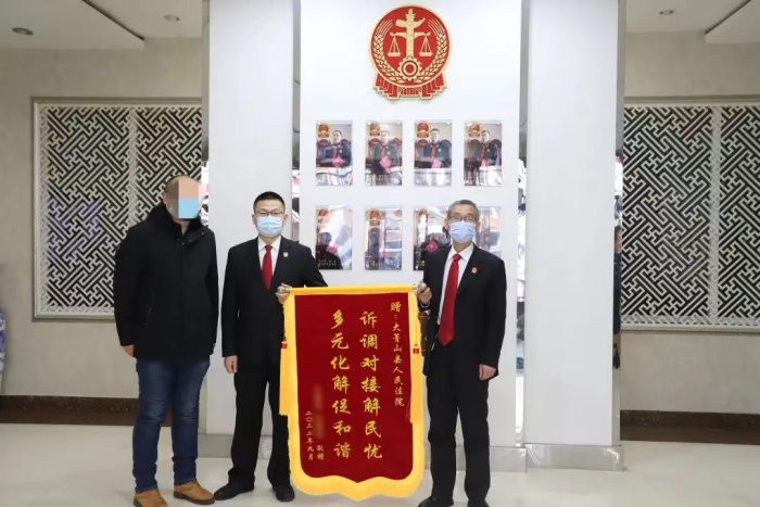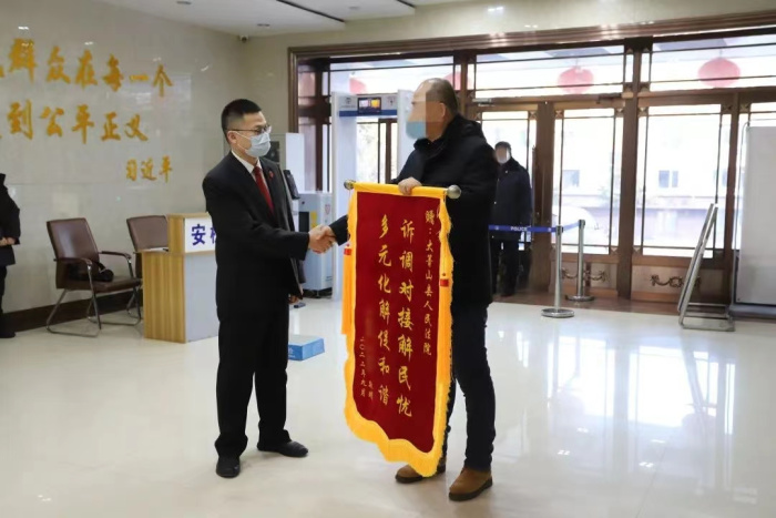 2023年1月17日,大箐山县法院收到当事人子女送来的一面印有“诉调对接解民忧 多元化解促和谐”的锦旗,“没想到我岳父的纠纷这么快就解决了,感谢法院高效化解纠纷,锦旗我早就做好了,为表达最真挚的感激之情,我必须亲手把锦旗交给你们。”王某某激动地说道。