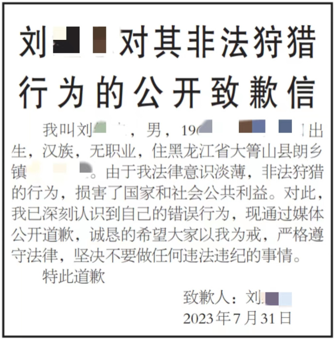 7月31日,大箐山县人民法院强制执行一起非法狩猎公开赔礼道歉案件,通过对被执行人采取高压执行措施,强制被执行人履行赔礼道歉义务,有力维护了法律尊严。