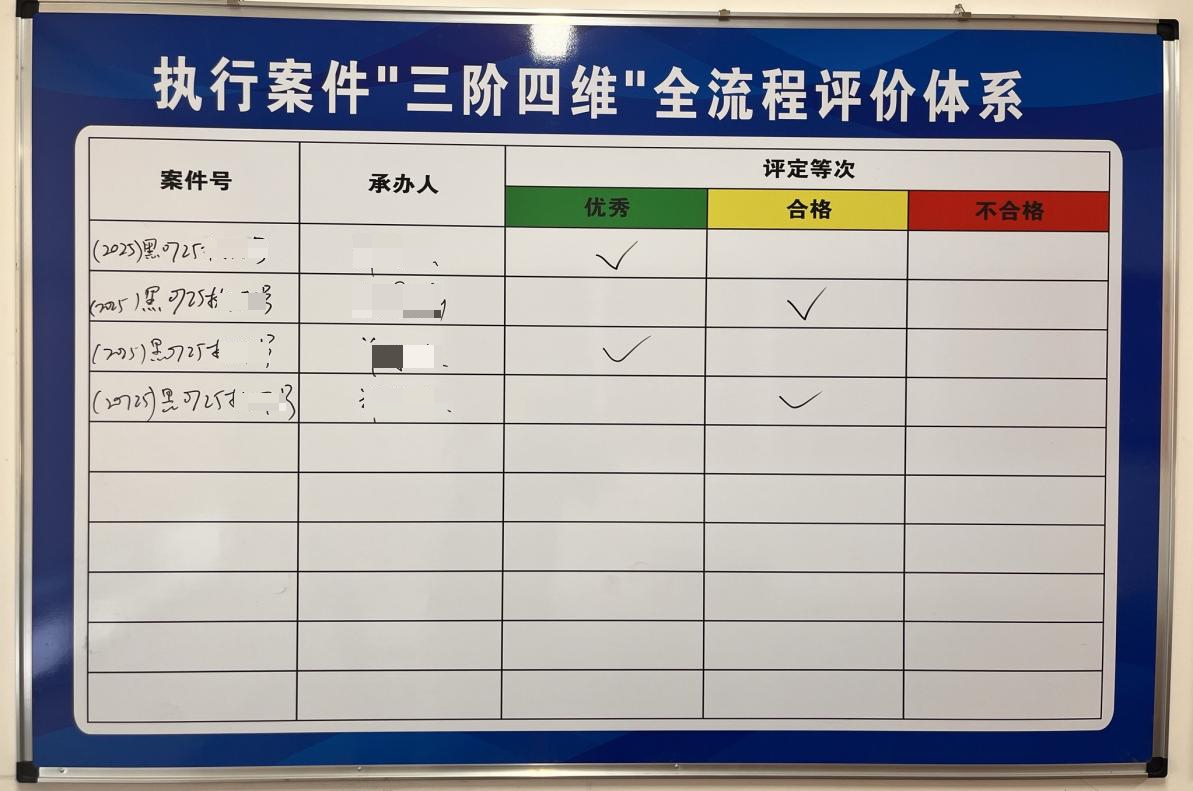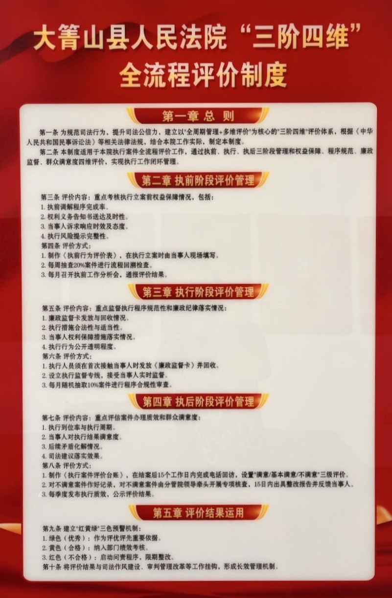 该制度以“全周期管理+多维评价”为核心,覆盖执前、执行、执后三个阶段,聚焦权益保障、程序规范、廉政监督、群众满意度四大维度,构建起执行工作闭环管理体系。