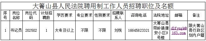 因工作需要,大箐山县人民法院面向社会公开招聘聘用制书记员1名。现将有关事项公告如下: