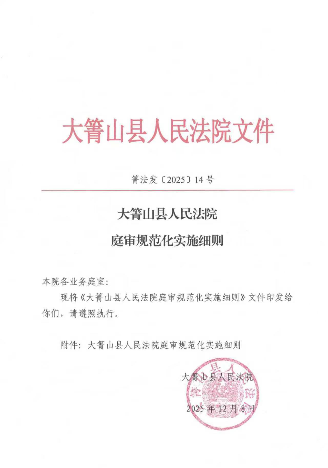 为进一步规范庭审活动,提升庭审质量、效率和司法公信力,全面落实司法责任制改革要求,近日,大箐山县人民法院正式制定并印发《大箐山县人民法院庭审规范化实施细则》。