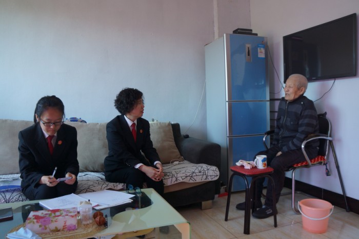万法官坐定后,同贾某交谈,详细地询问其他子女的情况和需要解决的问题,贾某时而清醒,时而糊涂,口中还不断重复“我寒心了”。最终在他小儿子和儿媳的帮助下,老人断断续续地讲述了事情的经过,书记员详细地记录了老人的诉求。随后,万法官向夫妻俩告知如何起诉及所需提交的材料,并让他们尽快向法院提起诉状,以便尽早立案。