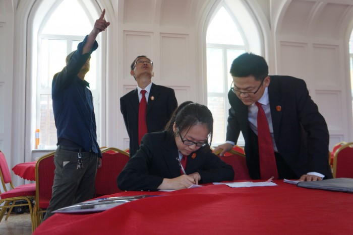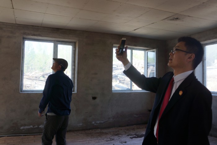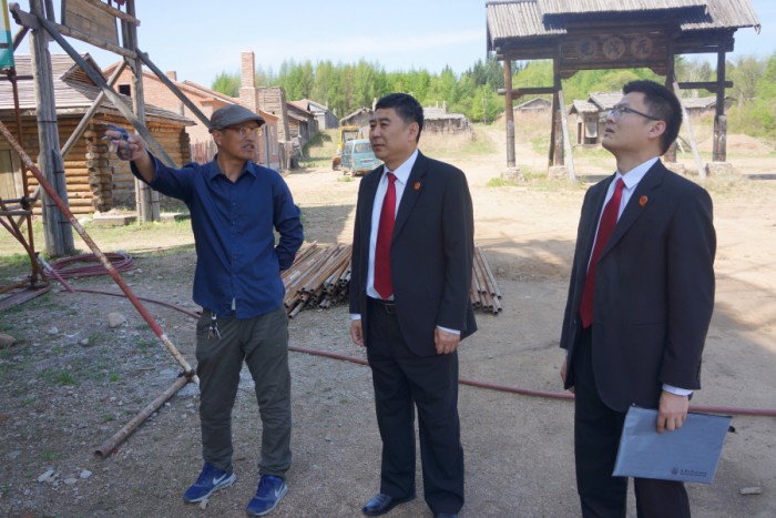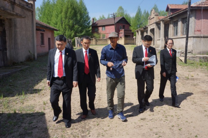 次日,青年主审法官郭运涛带领合议庭成员驱车30多公里来到位于带岭林业实验局某林场的工程所在地——影视城。下车后,法官们立即通过摄像、照相等方式,对双方争执问题进行实地勘查,并向相关人员了解具体情况,详细记录了调查的全过程。