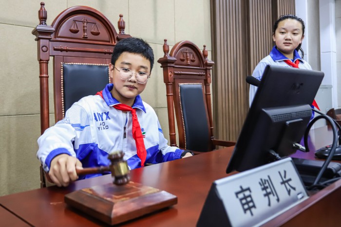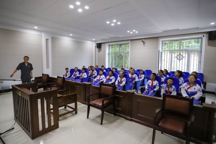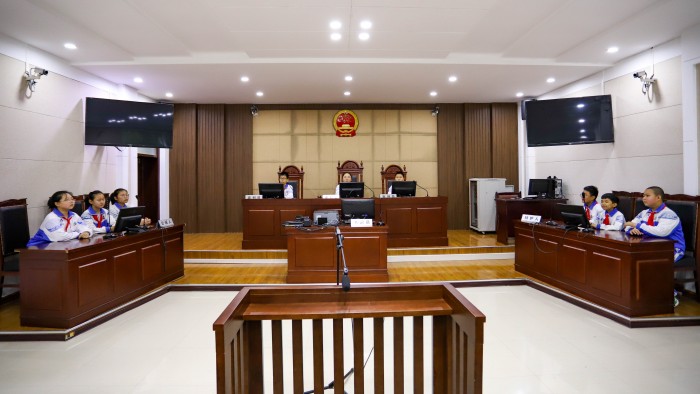 同学们最感兴趣的还是审判法庭,他们纷纷走上审判台,触摸和感受审判设施,在工作人员的指导下,坐上审判席,郑重地敲响法槌,进行了一场模拟庭审,亲身体验法庭审判的严肃与庄重。班主任老师:“同学们在模拟庭审过程中,不仅活跃了思维方式,锻炼了语言表达能力,而且潜移默化地普及了法律知识。同时也让学生们感受到了法庭的庄严和神圣。”
