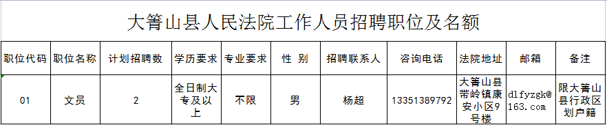 因工作需要,大箐山县人民法院面向社会公开招聘工作人员2名,其中聘用制文员2名。现将有关事项公告如下: